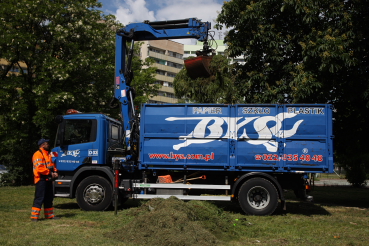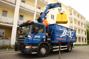 Świadcząc usługi odbioru odpadów posiadamy samochody skrzyniowe wyposażone w dźwig HDS z możliwością używania łyżki samozaładowczej do załadunku odpadów. Pojazdy te opróżniają pojemniki do selektywnej zbiórki odpadów typu Dzwon oraz stosowane są do zbierania odpadów gabarytowych. Możliwość stosowania łyżki samozaładowczej przyśpiesza prace załadunkowe. Jednorazowo możemy załadować i zabrać do 21m3 przygotowanych uprzednio śmieci np.: trawa, liście, gałęzie, odpady gabarytowe.