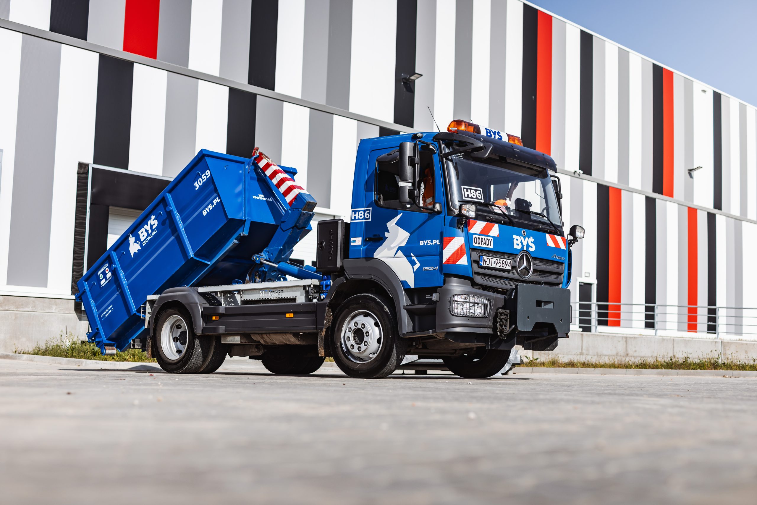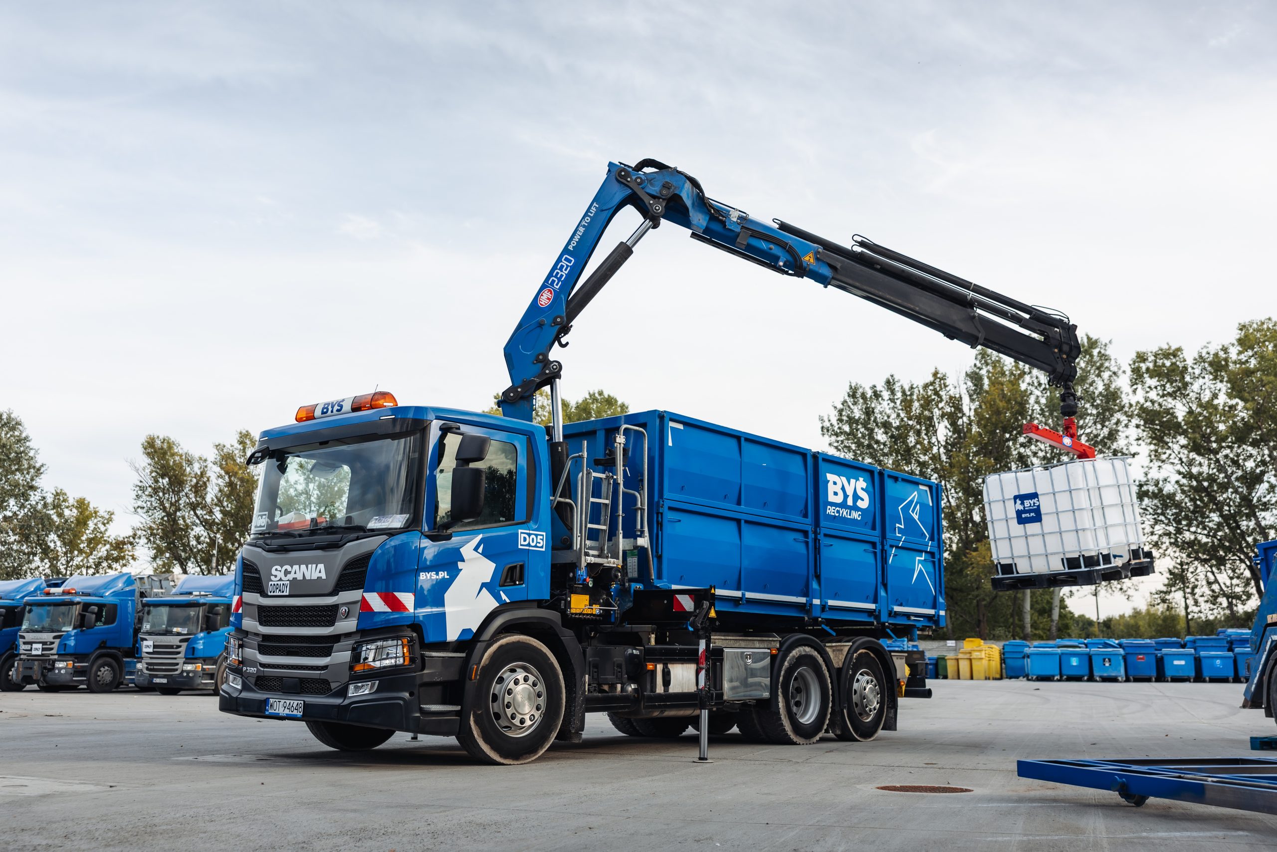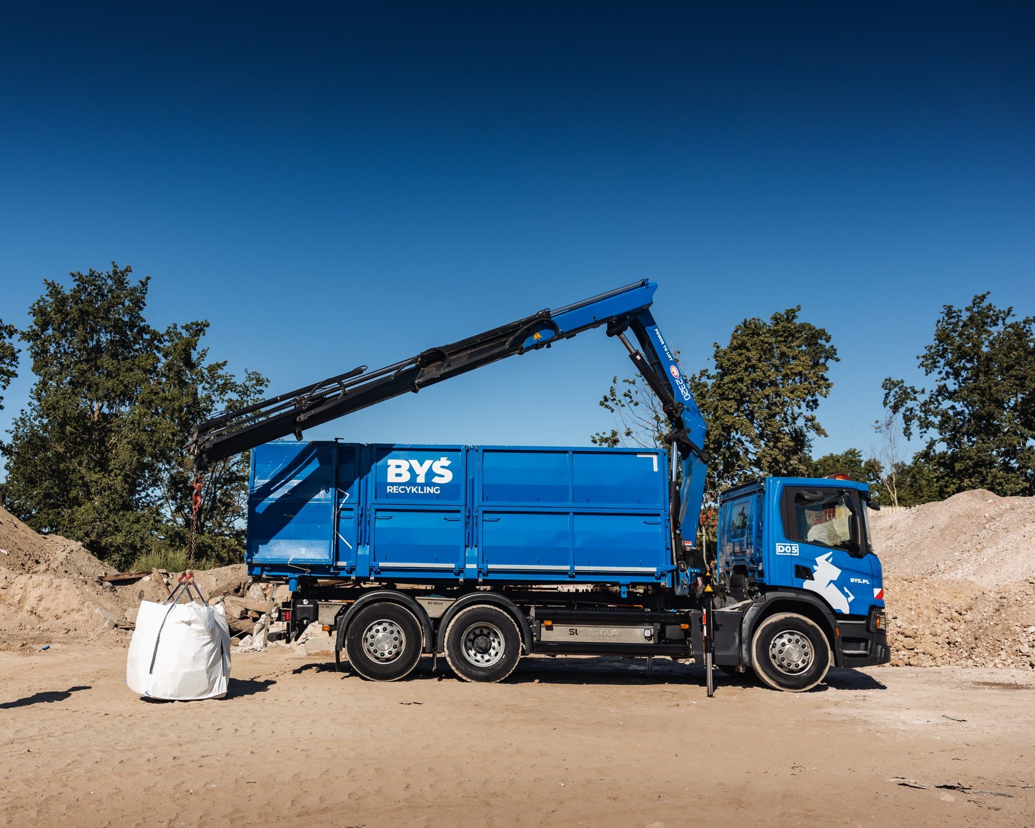 Świadcząc usługi odbioru odpadów posiadamy samochody skrzyniowe wyposażone w dźwig HDS z możliwością używania łyżki samozaładowczej do załadunku odpadów. Pojazdy te opróżniają pojemniki do selektywnej zbiórki odpadów typu Dzwon oraz stosowane są do zbierania odpadów gabarytowych. Możliwość stosowania łyżki samozaładowczej przyśpiesza prace załadunkowe. Jednorazowo możemy załadować i zabrać do 21m3 przygotowanych uprzednio śmieci np.: trawa, liście, gałęzie, odpady gabarytowe.
