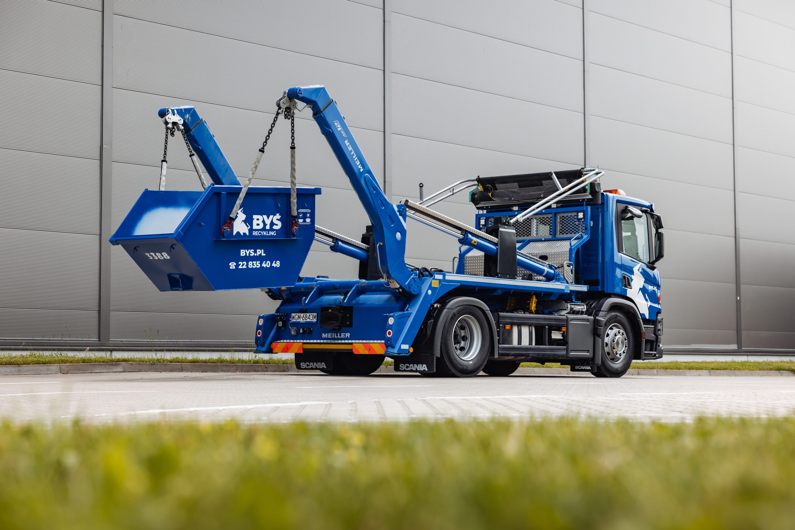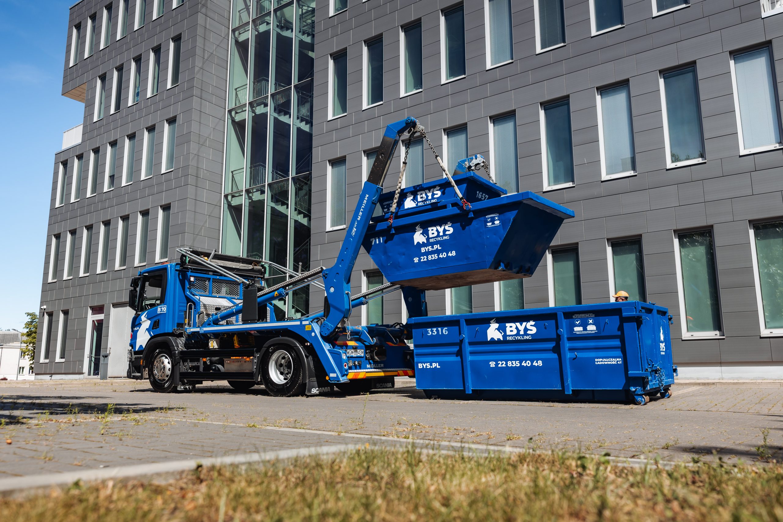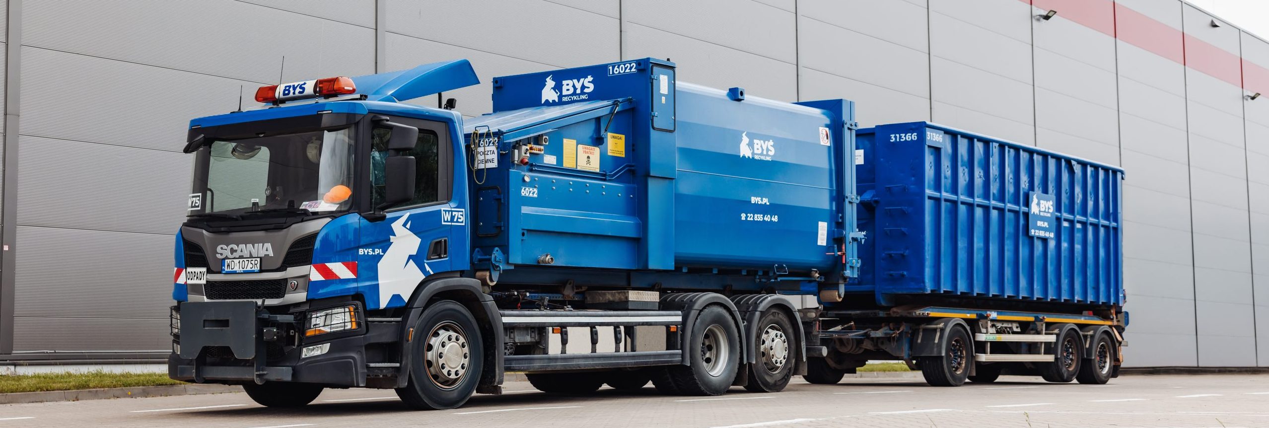 Świadcząc usługi odbioru odpadów posiadamy samochody skrzyniowe wyposażone w dźwig HDS z możliwością używania łyżki samozaładowczej do załadunku odpadów. Pojazdy te opróżniają pojemniki do selektywnej zbiórki odpadów typu Dzwon oraz stosowane są do zbierania odpadów gabarytowych. Możliwość stosowania łyżki samozaładowczej przyśpiesza prace załadunkowe. Jednorazowo możemy załadować i zabrać do 21m3 przygotowanych uprzednio śmieci np.: trawa, liście, gałęzie, odpady gabarytowe.